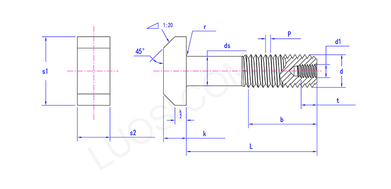 Huvudet på den reducerade skaftbulten med hål liknar en romb och kan fastna i t-slotten som ska fixas och inte rotera. Den mellersta delen av skruven har blivit tunnare, det vill säga den "krympade stången", och ett hål har också borrats på botten av skruven. Interiören är ihålig.
