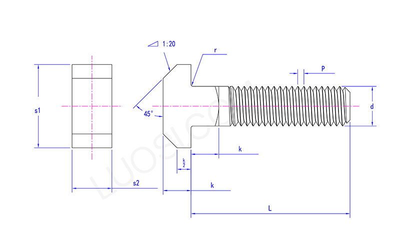 Fyrkantiga hals T -bultar är mycket igenkännliga. Sett från sidan är den del där huvudet ansluter till skruven, det vill säga nacken, en vanlig fyrkant, snygg och fyrkantig. Dessutom är halsens längd vanligtvis inte för lång och är i allmänhet ungefär samma tjocklek som den komponent som den är ansluten till. Skruvdelen är en cylindrisk metallstång, och dess tjocklek varierar beroende på bultens specifikationer. Skruvytan är graverad med trådar, som liknar formen som de vanliga bulttrådarna vi ser, i en spiralform och används för att dra åt muttern.
