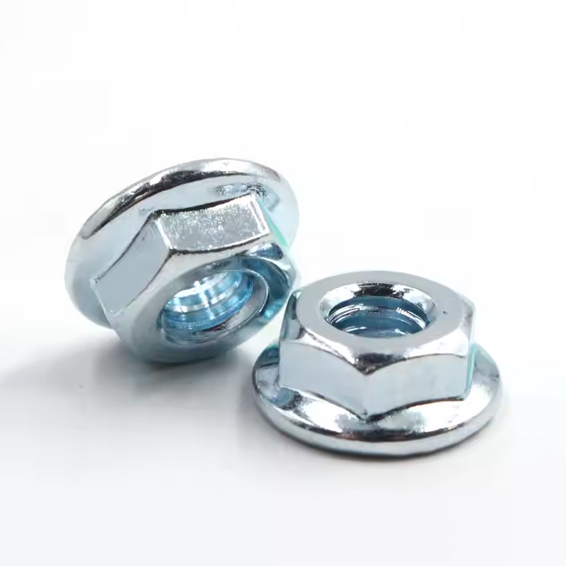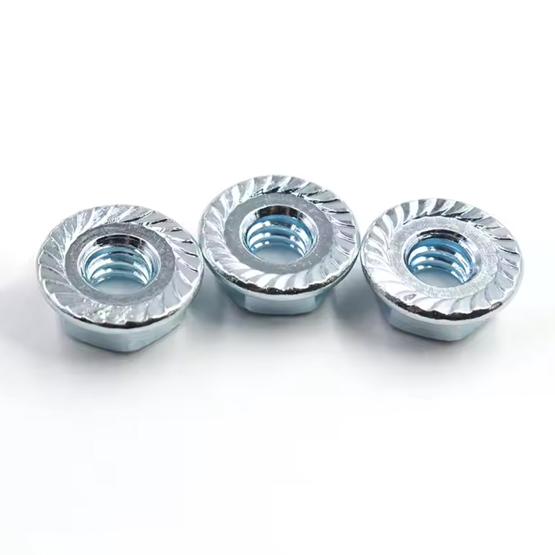 Flänsen längst ner påzinkpläterad hexagonflänsmutterhar tänder på ytan. Dessa tänder kan öka friktionen med ytan på de anslutna delarna vid åtdragning, effektivt förhindra att muttern lossnar och används vanligtvis i vibrationsmiljöer eller tillfällen som kräver stabila anslutningar, såsom fixering av fordon.